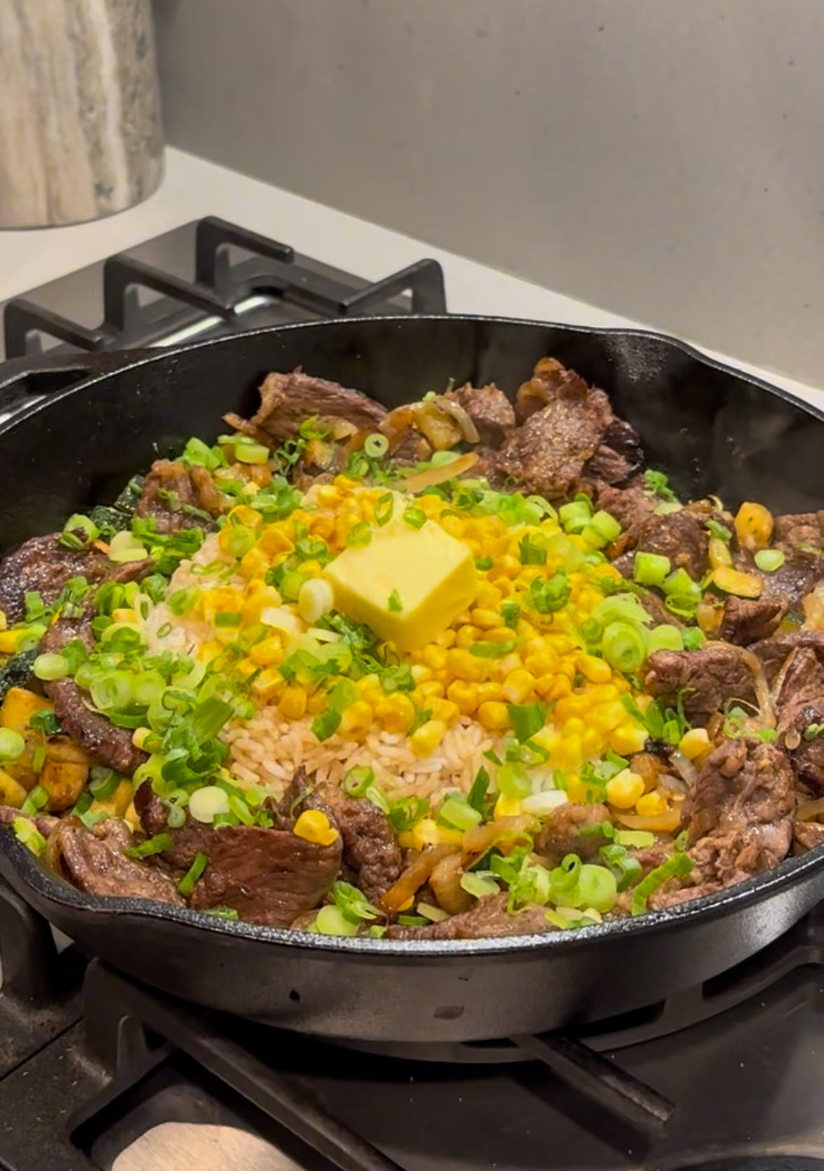 All I did was pick up some steak from Whole Foods on my way home, throw in a zucchini that I needed to use up (and also bc a girl needs her fiber ᵕ̈), and the rest is basically just pantry staples: rice, corn, onion, and butter. Which means you can pretty much throw this together whenever you’re in need of a little pick-me-up.
